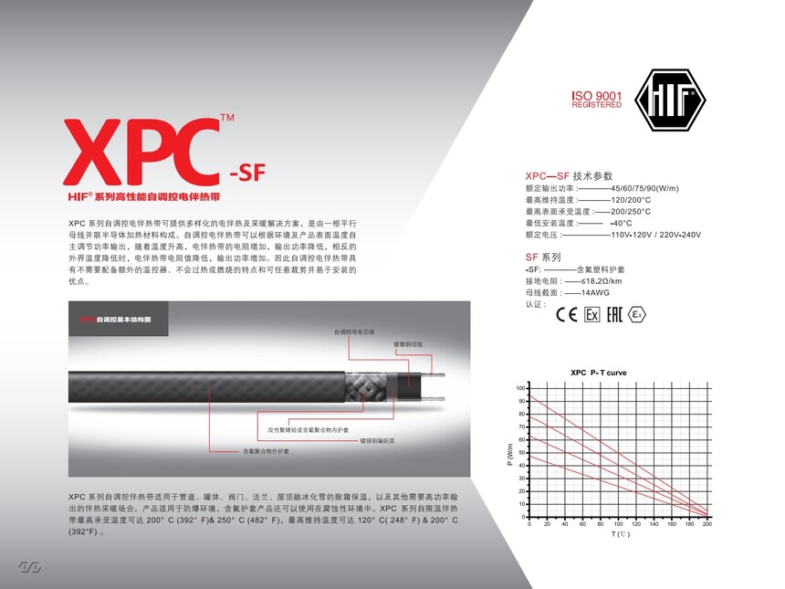 美国黑孚HIF超高温自限温伴热带 XPC系列XPC—SF技术参数 额定输出功率:————45/60/75/90(W/m) zui高维持温度:————120/200℃ zui高表面承受温度:——200/250℃ zui低安装温度:——— -40℃ 额定电压:——————110V-120V/220V-240V SF系列 -SF:————含氟塑料护套 接地电阻:——≤18.2Ω/km 母线截面:——14AWG